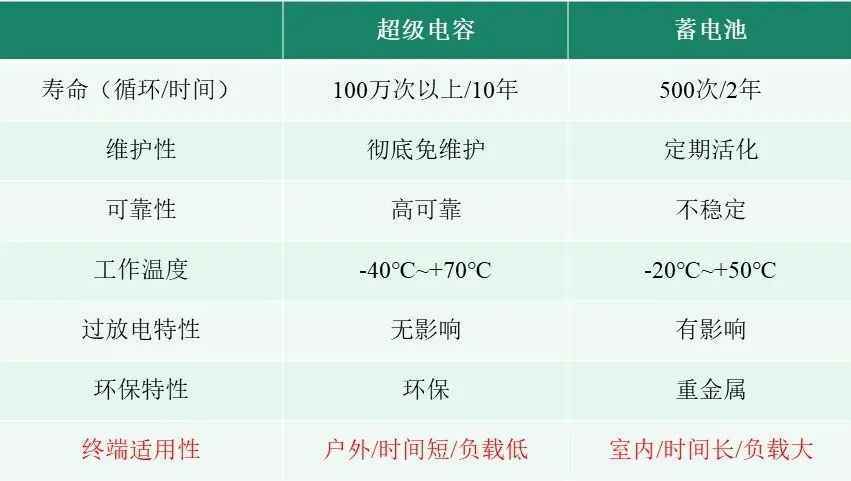 | 1 | 超级电容的高低温特性非常好,特别是低温特性好,在-40℃仍能够正常工作,无需其他保温措施即可正常工作,与蓄电池比较,真正做到了节能减碳 |